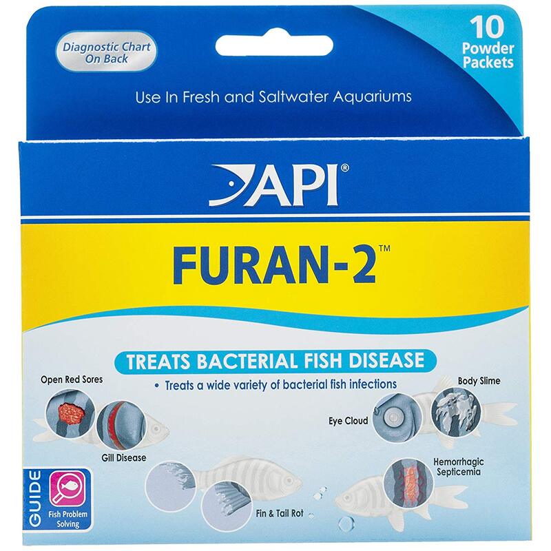 APIÂ Furan-2 powder Contains two furan compounds to combat a wide variety of gram-positive & gram-negative bacterial diseases, including bacterial gill disease, open red sores (Aeromonas spp.), body slime & eye cloud, black molly disease (Flavobacterium columnaris) and fin & tail rot. For use in both freshwater and saltwater aquariums. This medication will harm the biological filter. Note: This medication will cause a slight discoloration of water which can be removed with activated carbon.