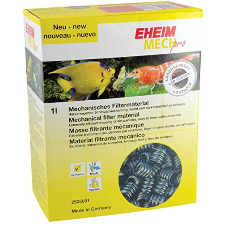Prefilter material made from hollow ceramic rings for trapping large dirt particles. Directly after entering the filtration cycle, water is swirled through the hollow ceramic rings. Larger dirt particles thus sink to the bottom. The treated prefiltered water then continues its way through the other filter layers. EHEIM MECH is easy to clean and reusable.