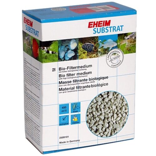 Standard bio-filter medium with large colonization area for bacteria cultures and high efficiency SUBSTRAT can be layered in one or more layers. It is a highly porous filter material made from sintered glass. The surface structure offers the important purification bacteria excellent colonization conditions. The colonizable area amounts to 450 m² per liter. EHEIM SUBSTRAT is suitable for fresh and marine water, is washable and can be reused.