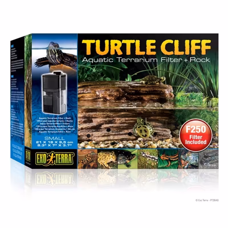 - The Exo Terra Turtle Cliff is equipped with a Repti Clear Terrarium Filter, an optimal water filtration system with large filter volume and effective flow control. The 3-stage filtration system allows alternate replacement for continuous biological filter activity, guaranteeing optimal mechanical, chemical and biological filtration. Additional filter material can be added to the chambers for increased filter performance. Aquatic heaters can also be concealed within the Exo Terra Turtle Cliff.