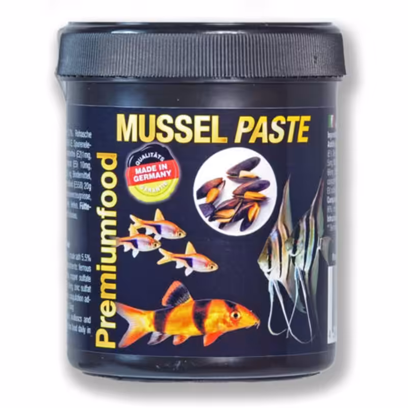 Mussel Paste – The sole food for all tropical fish Ingredients: Fish- and fish by-products, cereals, molluscs and crustaceans (5%), vegetables, oils and fat, yeasts.